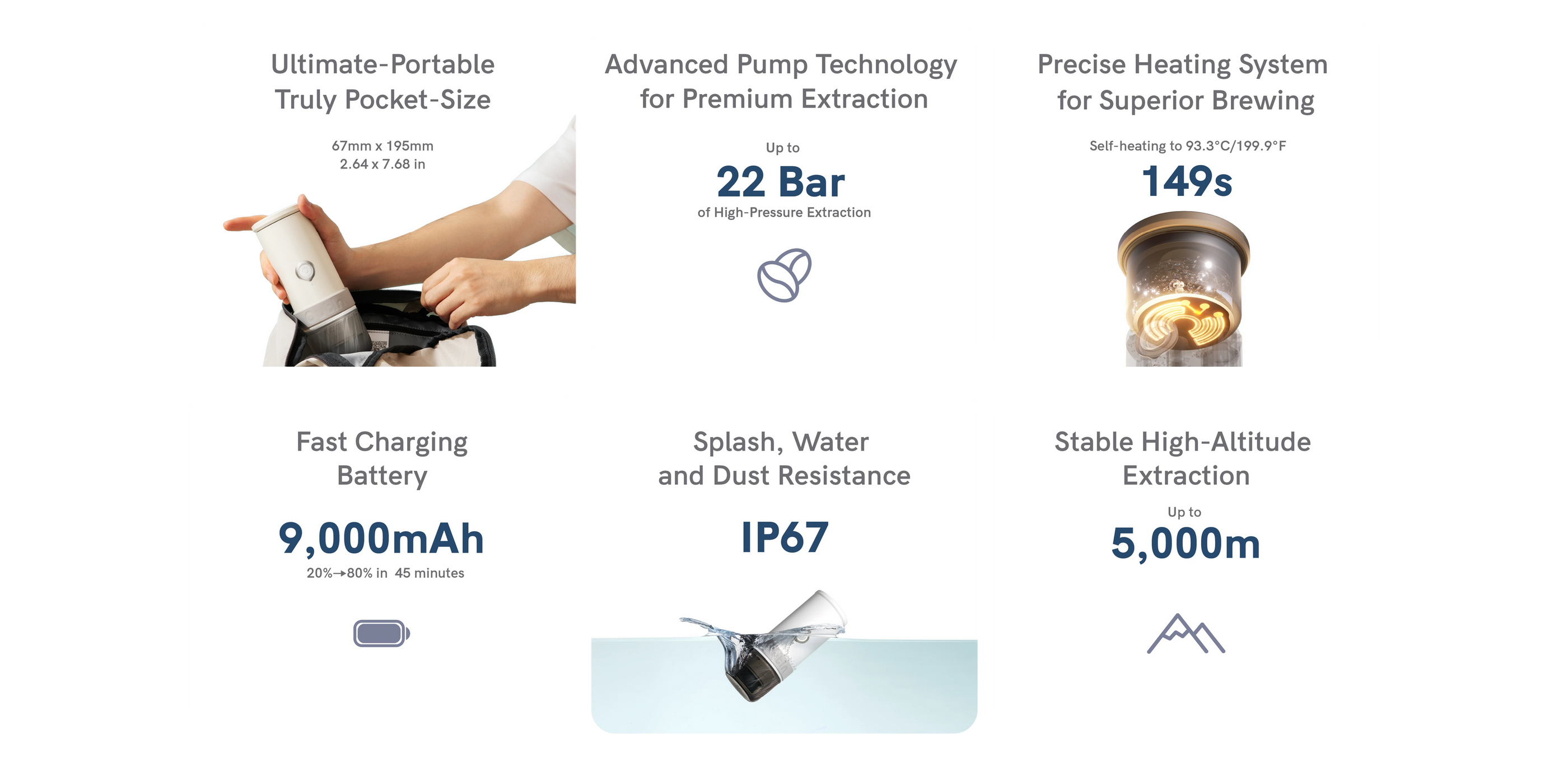 • Abenteuerbereites Design: Für Aktive gebaut – vom Zuhause bis zu Berggipfeln. Mit IP67-Schutz gegen Wasser, Staub und Spritzwasser sowie stabiler Extraktion bis zu 5.000 Metern Höhe.